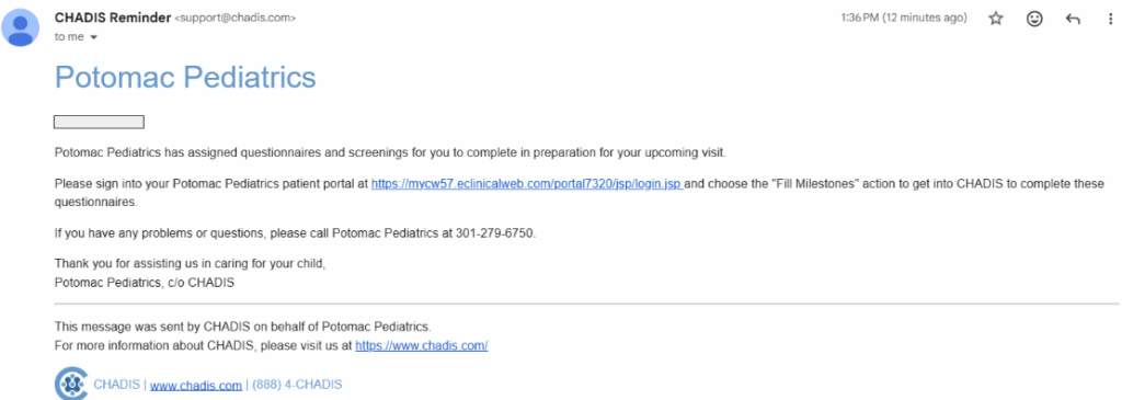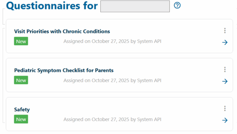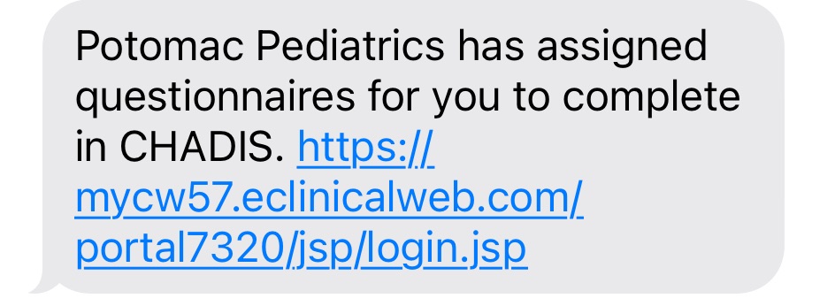 When your child’s Well Child Exam is scheduled, you will receive a text and/or email notification that questionnaires have been assigned for the visit.